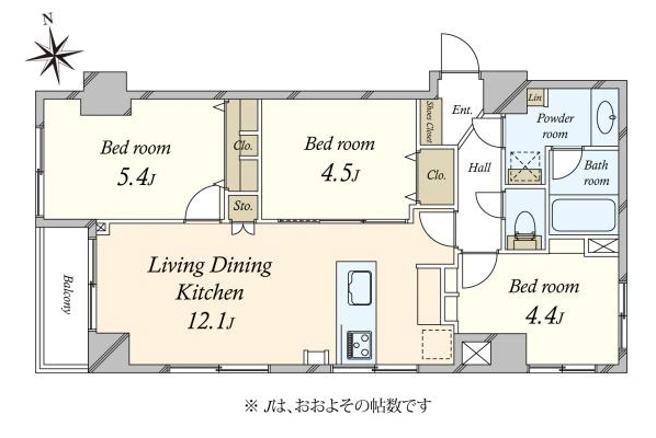 - ライフプランに寄り添う間取り: 専有面積58.46㎡に対し、間取りは「2LDK+S」。図面上は5.4帖、4.5帖、4.4帖の3つの個室(Bed room)が確保されています 。ご夫婦の寝室、将来の子供部屋、そしてテレワーク用の書斎など、ライフステージの変化に柔軟に対応できる使い勝手の良い設計です。